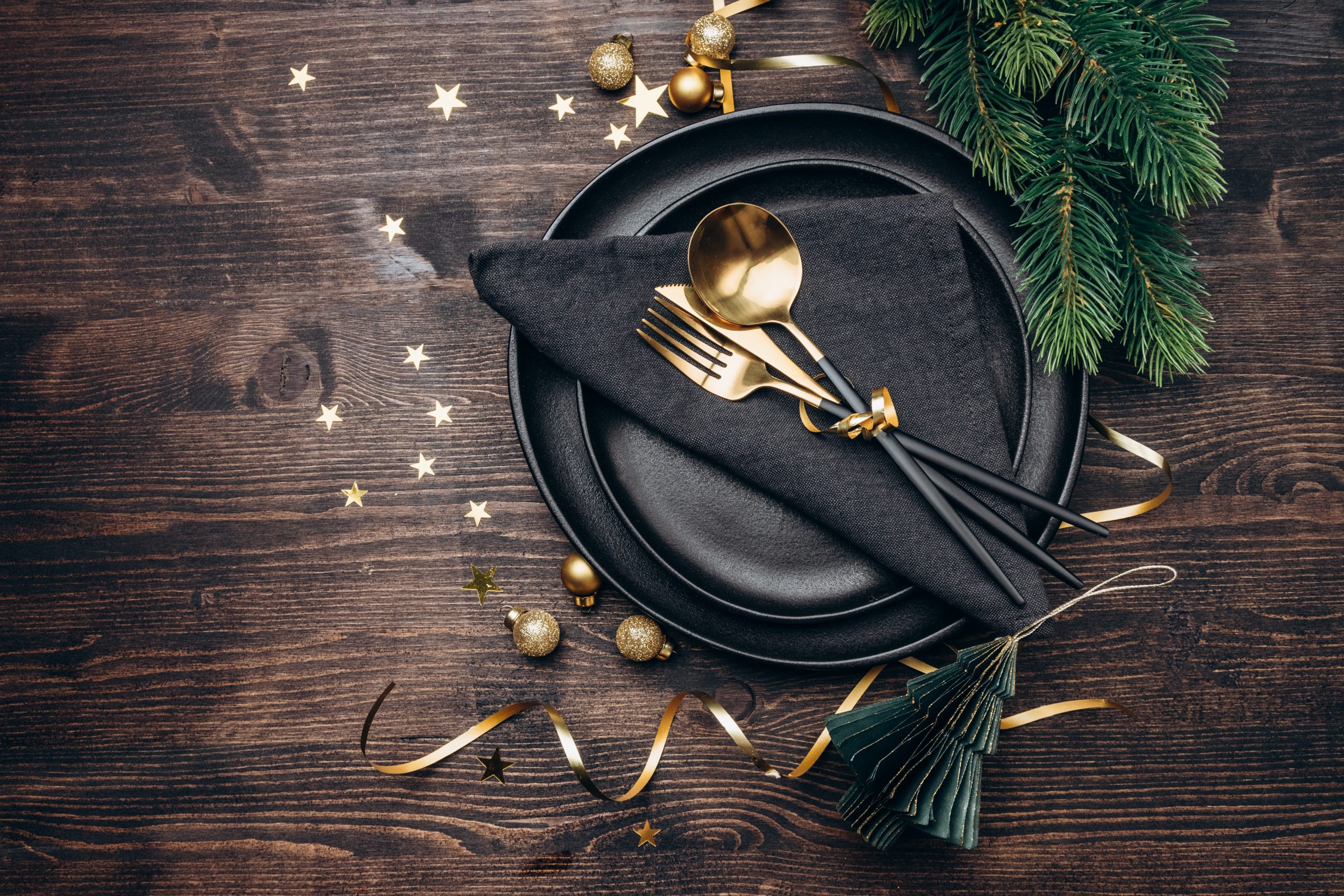 Christmas table setting black plates and gold decor