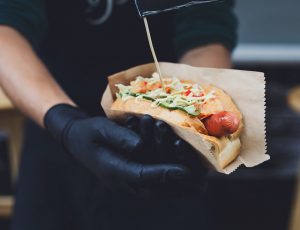 Street fast food, hot dog with grilled sausage